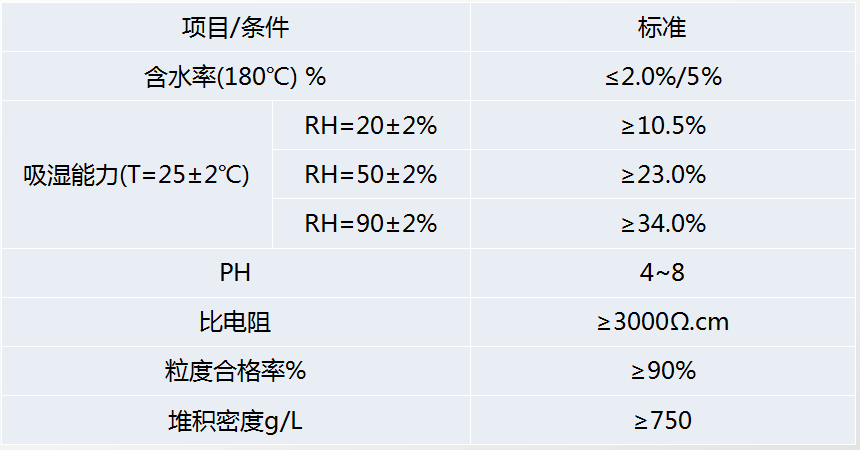 吸附性能均衡、热稳定性好、化学性质稳定、有较高的机械强度等。所以应用范围非常广泛,尤其在电子芯片、半导体、服装鞋帽等领域的防潮应用方面,但是其在常温常湿环境下,吸湿能力也只有30%左右,且原料生产工艺对环境污染较大,价格较贵。